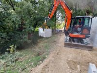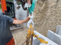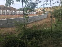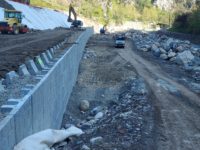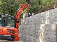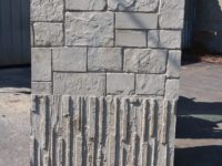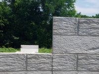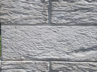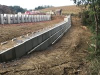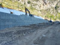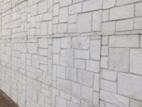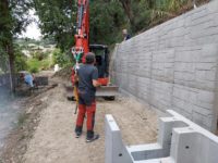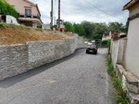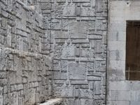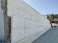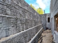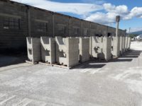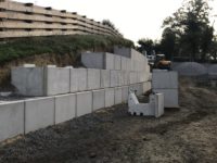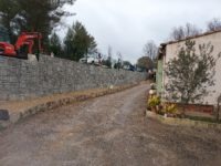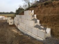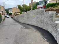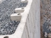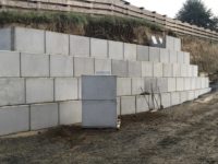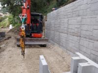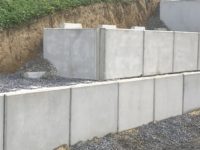 Stone aspect, exposed aggregate concrete. Custom stampings on request. Elements completely dry assembled. Integral locking thanks to the notch system. Possibility of several angles in relation to the vertical. Assembly with or without reinforcing geotextile. Patented system.
